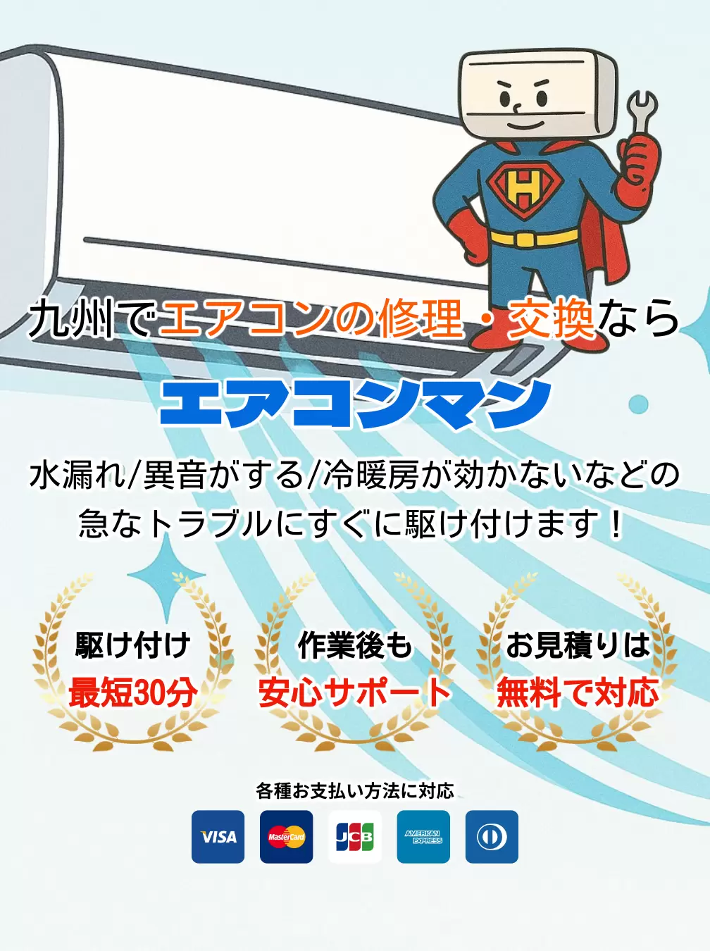 「エアコンが効かない」「電気代が高い」「急に動かなくなった」そんなお悩み、エアコンマンにおまかせください!私たちは九州全域に対応したエアコンのプロ集団です。取付・交換・修理まで、365日スピード対応します。最短即日訪問、適正価格&プロの技術力で安心のサービスをお届けします。